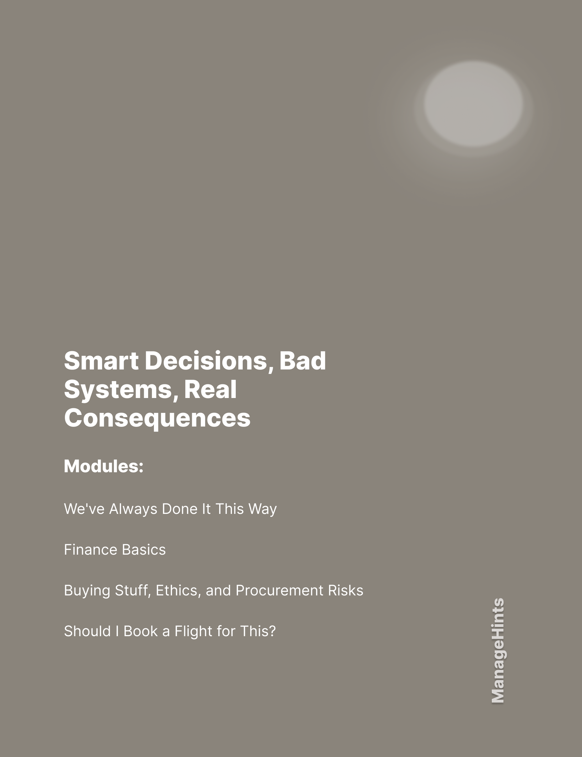 If you are dealing with outdated processes, financial blind spots, risky purchasing decisions, or questionable “we should probably go in person” assumptions, Smart Decisions, Bad Systems, Real Consequences offers concise, practical help. These ManageHints™ modules are designed to strengthen managerial judgment, reduce avoidable friction, and help you make better business decisions when the environment itself is part of the problem.